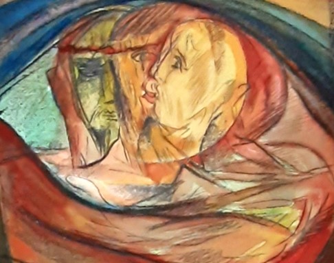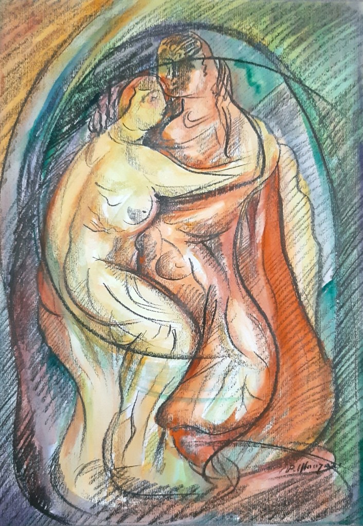 Nei suoi quadri l’immagine si sviluppa in un gioco complesso di associazioni che un filo invisibile sembra collegare cripticamente tra loro, completandone il senso e il messaggio logico. A tratti, si ha quasi la sensazione che lo stesso Artista assista al proprio processo creativo da spettatore: non dipinge l’oggetto pensato, ma lo pensa dipingendolo. La sua potente originalità si esprime pertanto attraverso forme che si presentano cariche di tensione, quasi a testimoniare che in lui, razionale e irrazionale, non sono due sfere distinte i cui pesi si bilanciano, ma due forze in perenne contrasto e di difficile risoluzione. Questo spiega la pregnante presenza cromatica del rosso, colore da sempre simbolo di forza istintiva, di impulsività e di emozioni inconsce, di vita e di rinascita e del blu, il colore dell’intelletto, dell’infinito e dell’equilibrio delle emozioni. Nell’immagine raffigurata nella xilografia “Il blu dietro il rosso” entrambi i colori, oltre a coesistere, sono il segno attraverso il quale l’Autore lascia trapelare di voler attribuire alla razionalità il potere di orientare e guidare ogni atto umano, sottraendolo in tal modo alla cieca forza dell’istinto primordiale. Che il rosso risultasse ricorrentemente presente nel suo universo cromatico, accendendolo di intensi riflessi, era del resto prevedibile, dato che ad essere raffigurato e declinato nelle sue molteplici manifestazioni, in un suo intero ciclo di opere, è proprio il sentimento amoroso collegato al rosso, colore per eccellenza della passione, ovvero di quella pulsione vitale che obnubila e stordisce la mente. Nel pastello acquerellato “Nella natura”, tra infuocate pennellate di rosso, i corpi di due amanti, attraverso l’abbraccio, sembrano saldati inun’inestricabile simbiosi di carne e di spirito. Eppure c’è qualcosa di più grande ancora che sembra trascenderli, una forza panteistica che li rende partecipi della natura delle acque e delle piante perché, proprio con quell’abbraccio, essi sono entrati a far parte della misteriosa e inimitabile vita del creato.