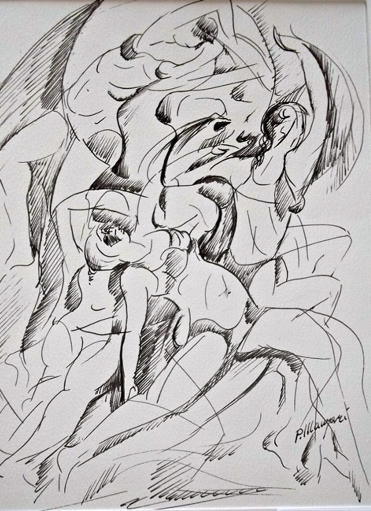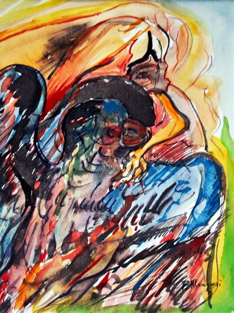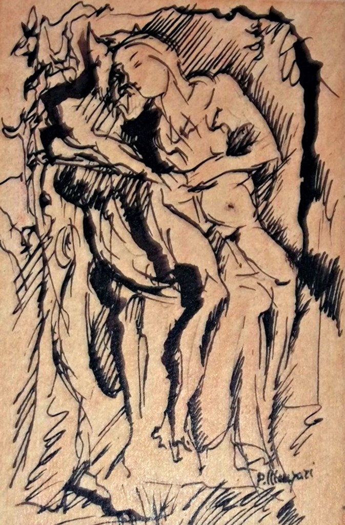 Il “Sacrificio per l’umanità” accanto alla cui raffigurazione del viso di Gesù in croce si vede l’immagine di quello pensoso e dolente di Dio, può essere in un certo senso considerato il messaggio criptico con cui l’autore ci mette a conoscenza del suo incontro col divino che è un tutt’uno, anche, con un più consapevole anelito di rigenerazione interiore. Immutato rimane comunque nel tempo il suo amore per la vita che, con empito prorompe né le “Danzatrici”. In questo inchiostro gli elementi raffigurati in tensione nello spazio, creano dei movimenti simili ad una danza la cui archetipica armonia sembra infatti vibrare all’unisono con quella della vita. Ancora oltre c’è solo l’Infinito e Manzari in quest’opera, come pure in diverse altre, sembra averne carpito per un attimo la luminosa essenza. Professoressa Lea Di Salvo