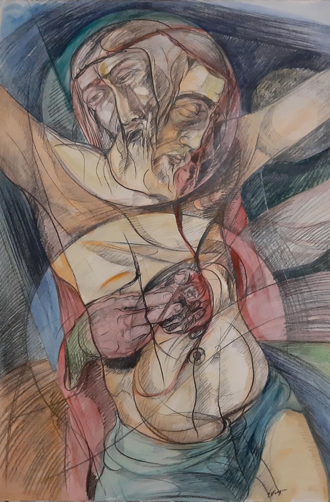 Se per l’Autore l’amore può essere a volte metafora di rovina, talaltra può diventare anche motivo di delirante dolore e umiliazione quando, come ne “Il bacio traditore”, si scopre con i propri occhi il tradimento subito. Anche in quest’opera è possibile pertanto notare una preponderante presenza del rosso, colore che in questo caso sembra volere simboleggiare ad un tempo la passione che travolge chi tradisce e le ferite che lacerano il cuore di chi invece è tradito. Il tema del tradimento ritorna anche ne “Il bacio di Giuda” in cui, nella stessa figura, l’Artista non dà soltanto tre aspetti del personaggio, ma raffigura altresì verità diverse tra loro, di cui nessuna è più vera dell’altra, a testimonianza del fatto che la contraddizione è da sempre intrinsecamente connaturata nell’animo umano.